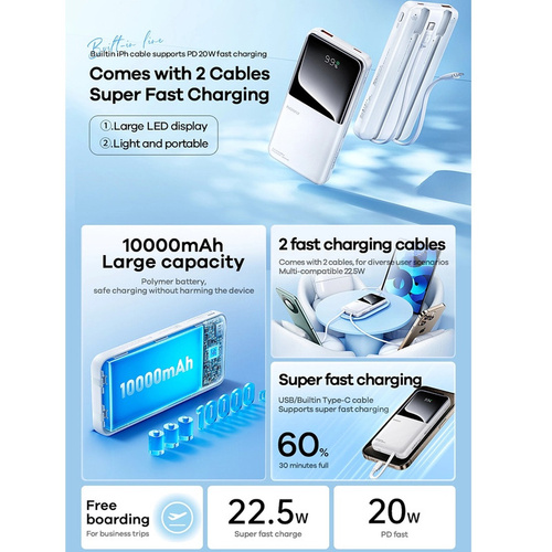 استفاده از پاوربانک در سفرهایی که دسترسی به برق شهری محدود و یا غیر قابل دسترسی است می تواند استفاده زیادی داشته باشد و نیاز به شارژر را در انواع گوشی های هوشمند برطرف کند. پاوربانک فست شارژ 10000mAh ریمکس مدل RPP-502 با داشتن قابلیت شارژ سریع با توان های 22.5 وات و 20 وات می تواند در مدت زمان بسیار کوتاهی انواع گوشی های هوشمند تلفن همراه و سایر دیوایس ها را شارژ کند.تکنولوژی شارژ سریع یکی از مهم ترین قابلیت هایی است که در سال های اخیر با توجه به عملکرد سریع در شارژ مورد علاقه کاربران بوده است. پورت های این پاوربانک با دارا بودن قابلیت شارژ سریع با توان 22.5 وات و 20 وات قادر است که با سرعت بسیار بیشتری گوشی های هوشمند تلفن همراه و سایر دیوایس ها را شارژ کند. شارژ خود پاوربانک نیز با توان 18 وات و کابل فست شارژ می تواند شارژ شود.پاوربانک فست شارژ 10000mAh ریمکس مدل RPP-502 دارای سه پورت در قسمت جلویی است که 2 تا از این پورت ها ورودی بوده و شامل پورت تایپ C با ولتاژ 5 ولت – 2 آمپر، 9 ولت – 2 آمپر و 12 ولت – 1.5 آمپر با توان حداکثر 18 وات و پورت لایتنینگ با ولتاژ 5 ولت – 2 آمپر، 9 ولت – 2 آمپر و 12 ولت – 1.5 آمپر با توان 18 وات می تواند برای شارژ خود پاوربانک مورد استفاده قرار گیرد.پورت های خروجی آن شامل یک عدد پورت USB است که با ولتاژ 4.5 ولت – 5 آمپر، 5 ولت – 4.5 آمپر، 5 ولت – 3 آمپر، 9 ولت – 2 آمپر، 12 ولت – 1.5 آمپر با توان حداکثر 22.5 وات و یک کابل تایپ C با ولتاژ 4.5 ولت – 5 آمپر، 5 ولت – 4.5 آمپر، 5 ولت – 3 آمپر، 9 ولت – 2 آمپر، 12 ولت – 1.5 آمپر با توان حداکثر 22.5 وات و کابل لایتنینگ با ولتاژ 5 ولت – 3 آمپر، 9 ولت – 2.22 آمپر، 12 ولت – 1.67 آمپر با توان حداکثر 20 وات می تواند برای شارژ انواع دیوایس ها استفاده شود.باتری استفاده شده در پاوربانک فست شارژ 10000mAh ریمکس مدل RPP-502 از نوع لیتیوم پلیمری است تا با توجه به حجم بالای این محصول وزن آن کم باشد. اما نکته قابل توجه در مورد این نوع از باتری ها امنیت بالای آن است. علاوه بر امنیت باتری، قابلیت کنترل جریان ورودی و خروجی در این پاوربانک موجب شده تا این پاوربانک در مقابل ولتاژ بیش از حد، جریان بیش از حد، شارژ بیش از حد، داغ شدن بیش از حد و افزایش دما از باتری پاوربانک و دیوایس های متصل به آن مواظبت کند.